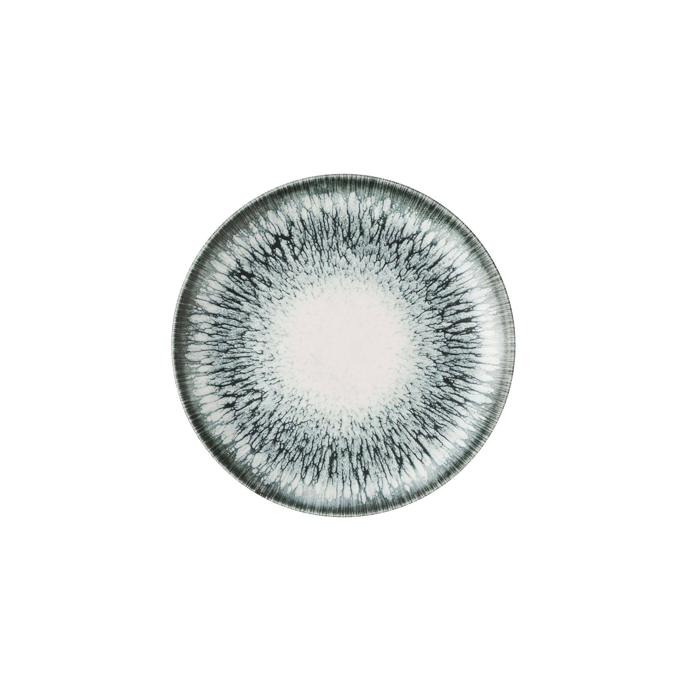 The Lumé Black Evolve Coupe Plate ø 21.7 cm (ILUBEVP81) is part of Churchill 's luxurious Lumé Black collection , a series known for its deep, matte black and subtle reactive glaze. The hand-decorated finish creates soft variations in tone and texture, making each plate unique.