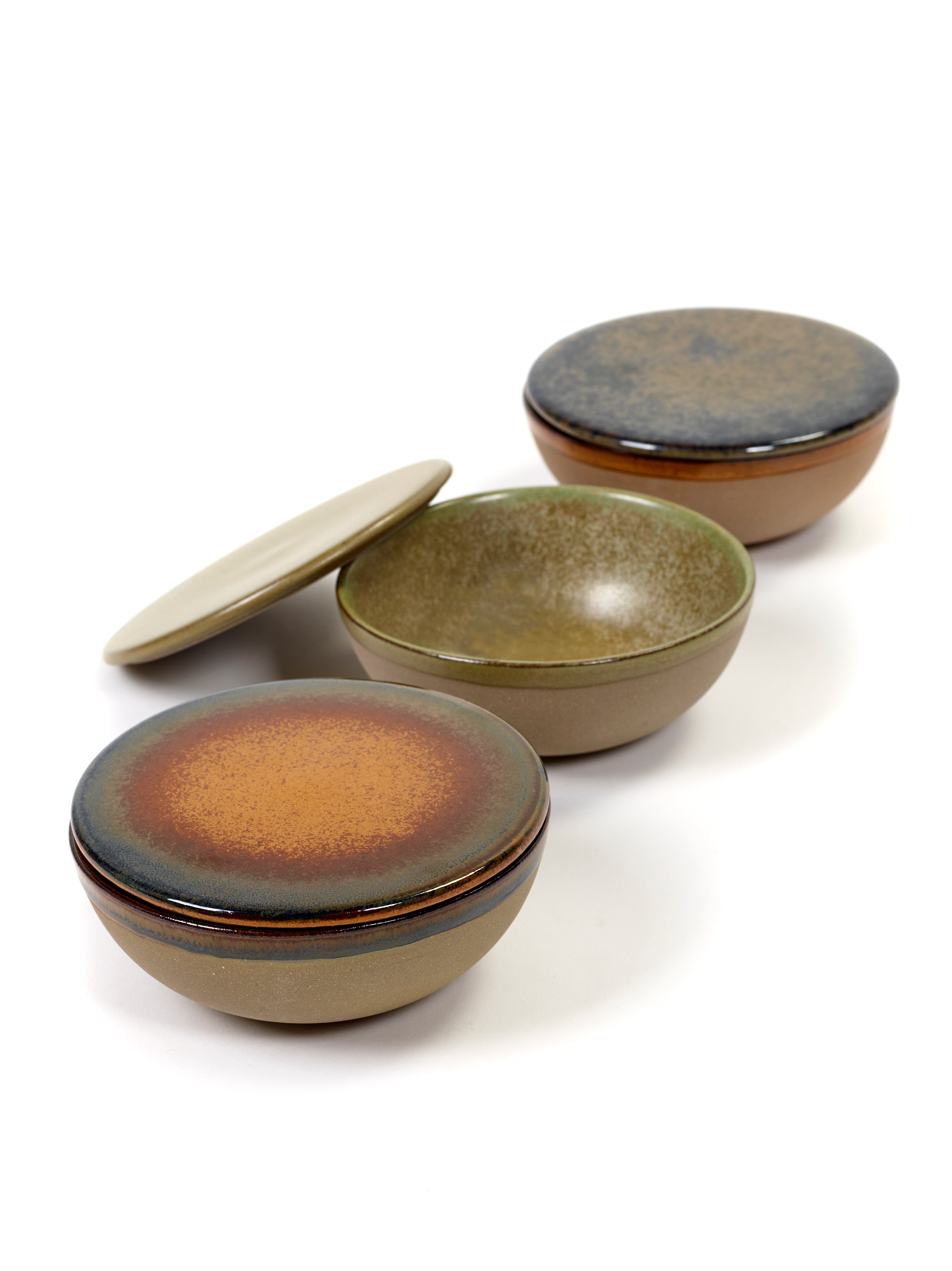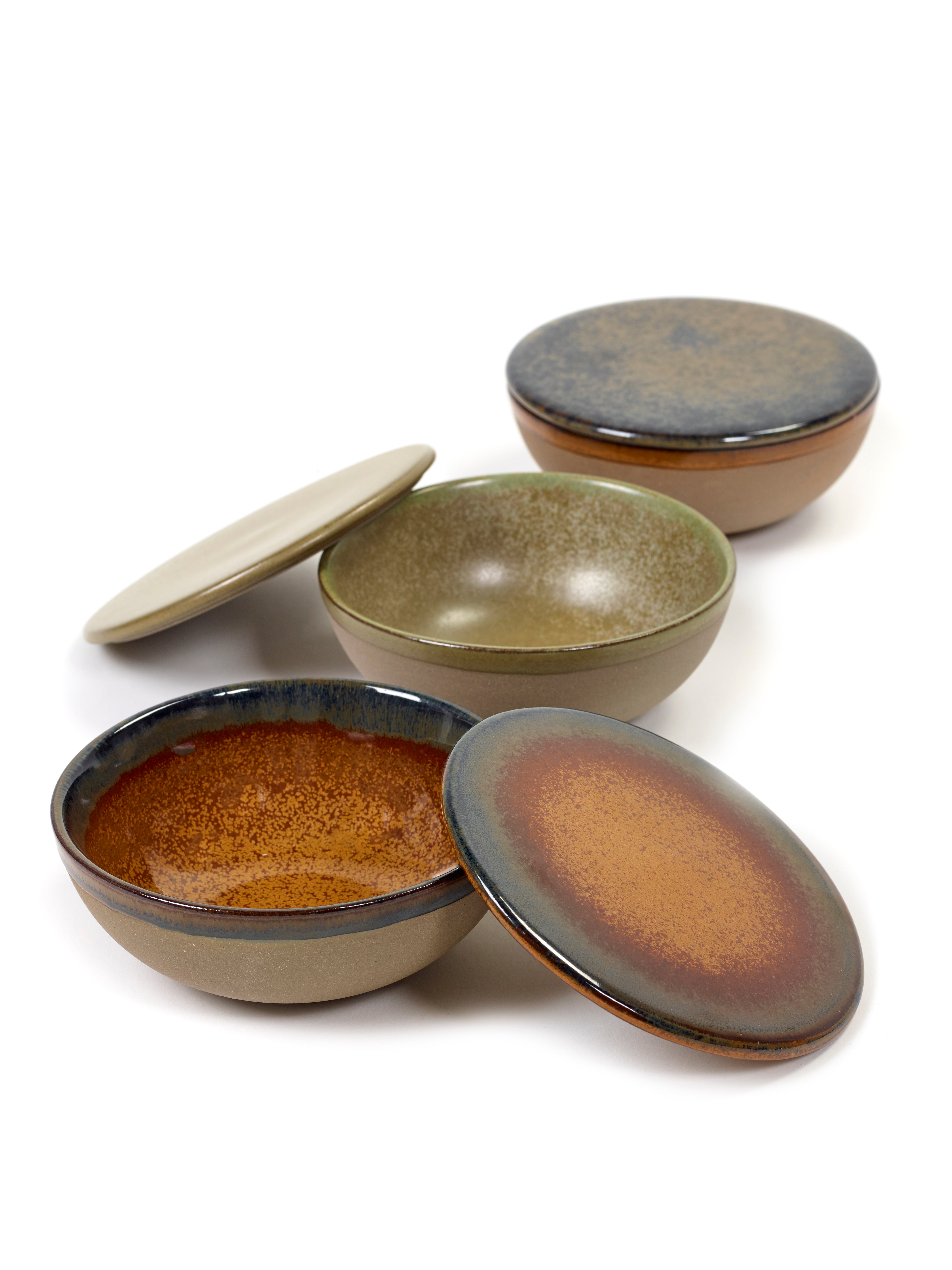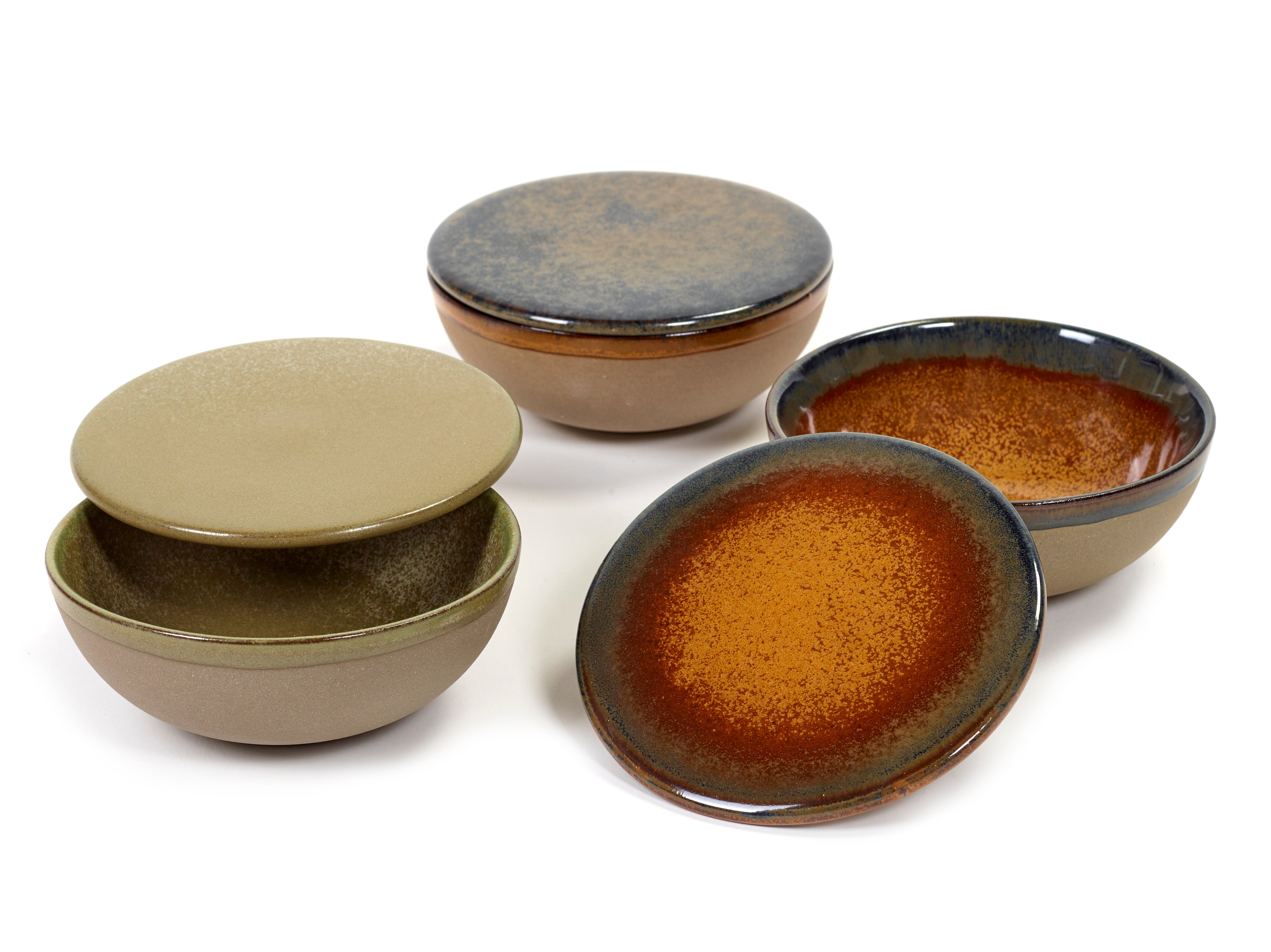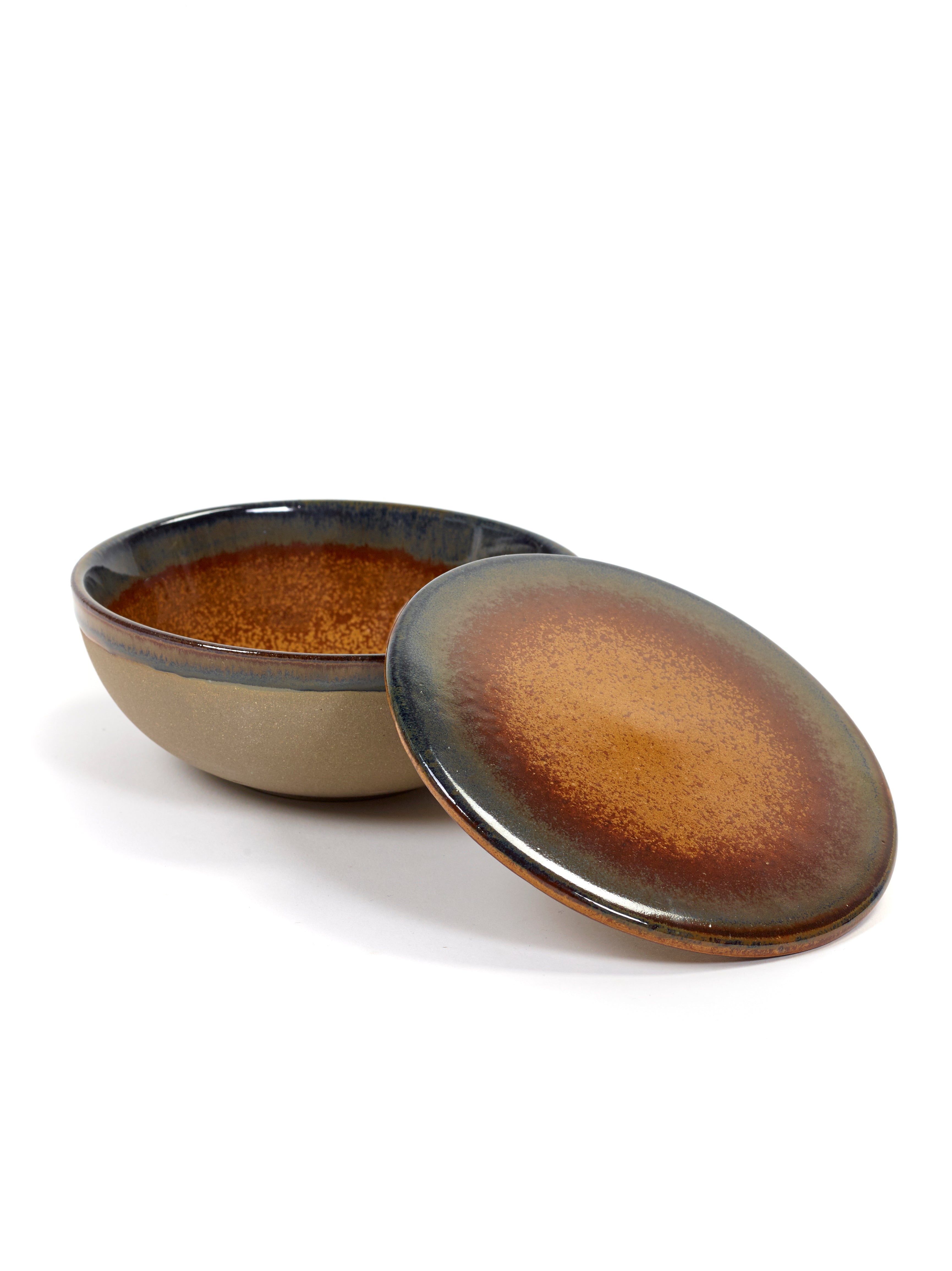 Deze kom met deksel is ideaal voor het serveren van soepen, sauzen, dips, tapas of kleine gerechten. Het deksel houdt de inhoud warm en beschermt tegen uitdrogen. Ook perfect voor het bewaren van ingrediënten of als stijlvol opbergstuk. De combinatie van Grey en Rusty Brown kleuren verwijst naar de gelaagde texturen van het Zeeuwse landschap.