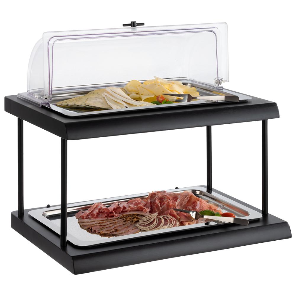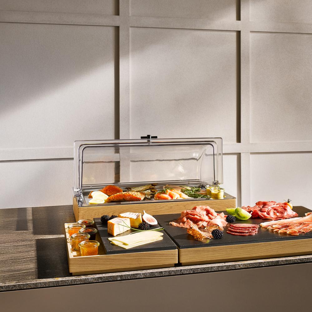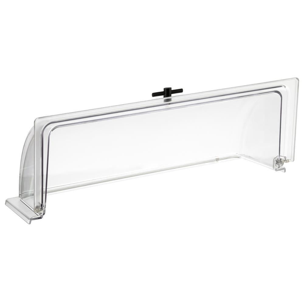 Dankzij het afrolbare mechanisme kan de cover soepel geopend en gesloten worden, zonder dat de deksel volledig verwijderd hoeft te worden. Dit zorgt voor gecontroleerde toegang tot de gerechten en draagt bij aan een nette en professionele buffetpresentatie. De transparante uitvoering maakt de inhoud goed zichtbaar, terwijl het gerecht beschermd blijft tegen uitdroging en externe invloeden.